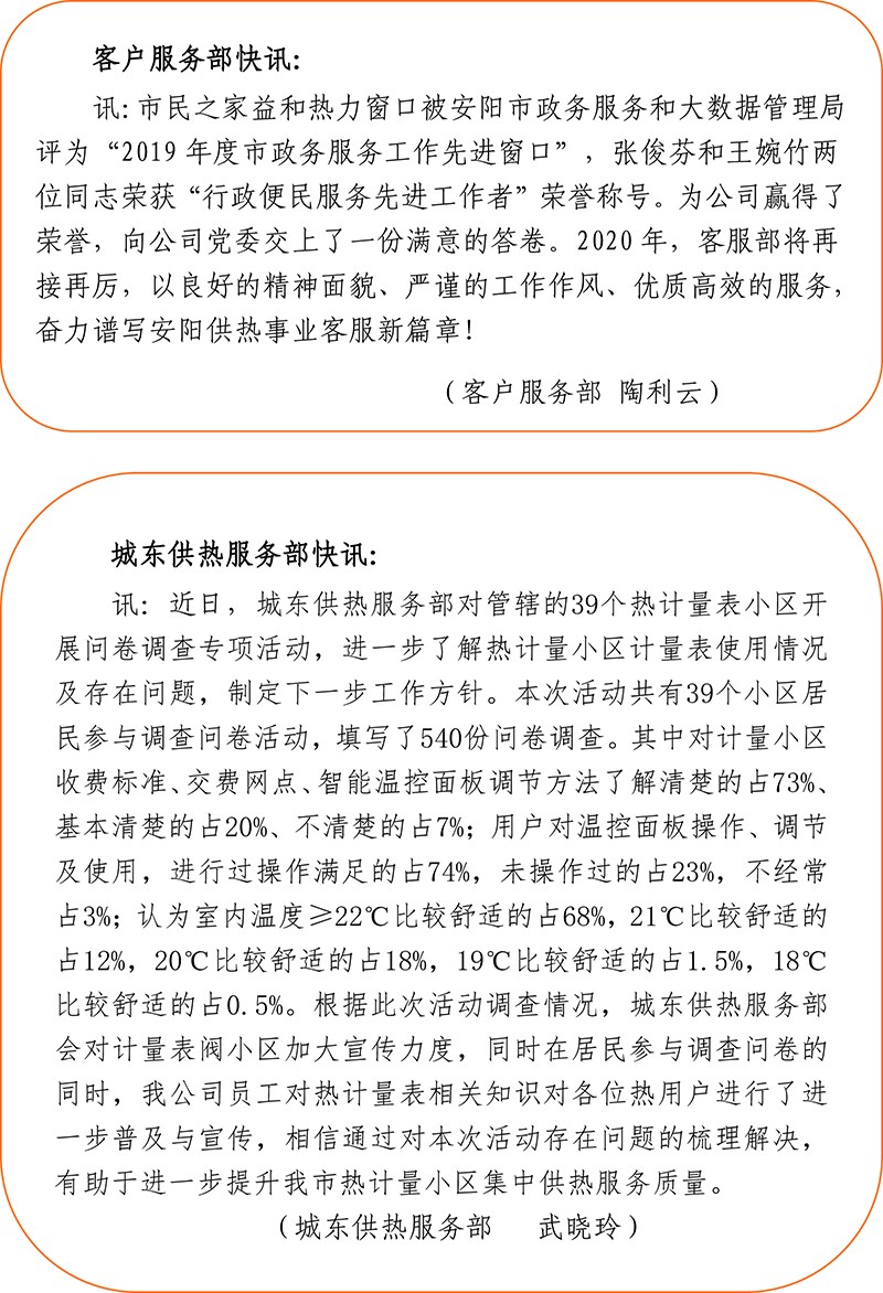 楊總在工作報告中指出,上一年通過公司全體干部職工的克難攻堅、上下合力、團結協(xié)作,全年各項經(jīng)濟效益指標均達到預期目標。2020年,我們要以習近平新時代中國特色社會主義思想為指導,全面貫徹黨的十九大和十九屆二中、三中、四中全會精神,增強“四個意識”、堅定“四個自信”、做到“兩個維護”,強力落實各級關于深化國有企業(yè)改革的政策要求,堅決執(zhí)行市委市政府和市住建局黨組的決策部署,秉承“把以人民為中心作為一切工作的出發(fā)點、落腳點和方法論”的企業(yè)宗旨,堅持“科技引領、規(guī)范管理、優(yōu)良管網(wǎng)、一流服務”的發(fā)展理念,嚴格“目標明確、時限明確、責任明確、結果明確”的工作要求,堅定地擔負起集中供熱建設發(fā)展的重大使命,擔負起實現(xiàn)國有資產(chǎn)保值增值的重大責任,堅定地推進創(chuàng)新變革、效率變革和質量變革,做強做大做優(yōu)國有資本,務實創(chuàng)新、同心同德,為全市實現(xiàn)“一個重返、六個重大”貢獻益和力量。